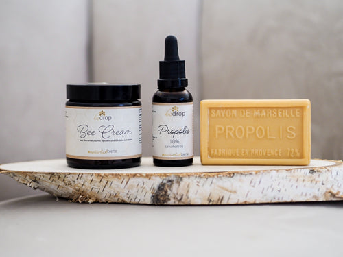 Propolis is also known as bee resin, which the bees collect from the resins of the trees and chew in their mouths, adding various enzymes in the process. Each propolis is different, as the resin is collected from different trees and therefore varies in taste, color and, in rare cases, smell. The consistency of the propolis is sticky and soft when collected, then changes to a porous, brittle and firm consistency. The bees use the propolis for their hive, as protection, hygiene and insulation. When bees fly into the hive, they graze on the propolis, which disinfects the returning worker and honey bees and thus keeps bacteria and microbes away from the inside of the hive. Possible effects can be achieved by taking propolis capsules not only more easily, but also as a supplement to the diet (no vitamin replacement, etc.). The capsule has a recommended dosage that can be taken with liquid. In contrast to a propolis tincture, propolis capsules have the advantage of not tasting the intense flavor of propolis. Due to the specified dosage, the propolis capsules can also be easily taken on the go and divided throughout the day.