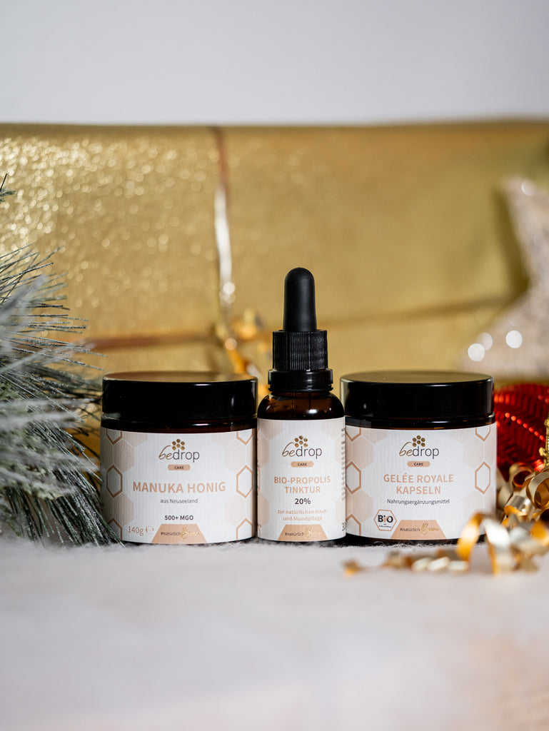 Das Bleib-Stark Set bietet deinen Liebsten mit den drei Bienenprodukten Manuka Honig, Gelée Royale Kapseln und Propolis Tinktur 20% alles was deine Liebsten über den Winter benötigen, um gestärkt zu bleiben.