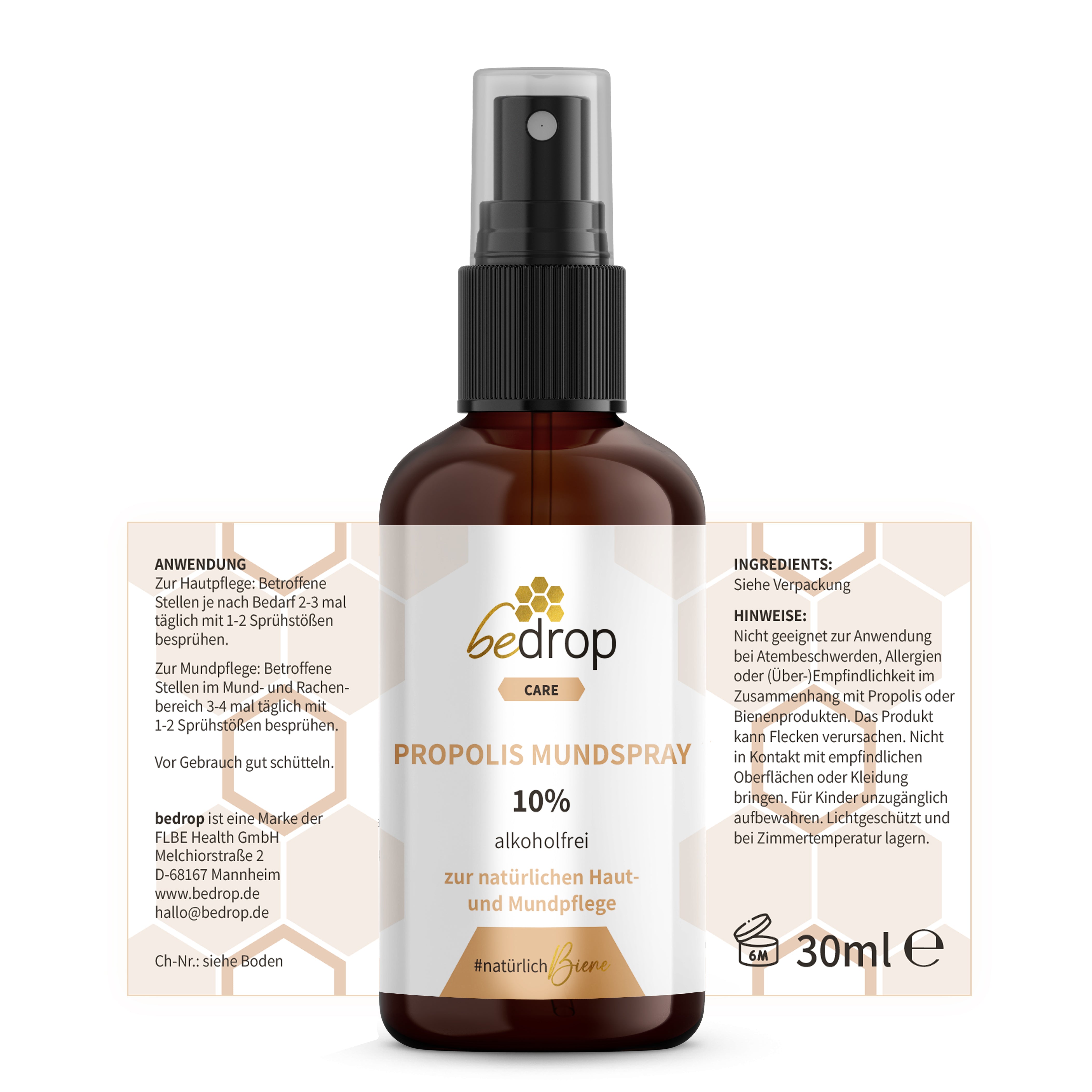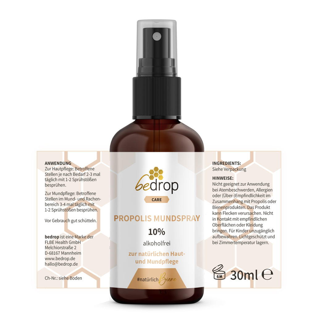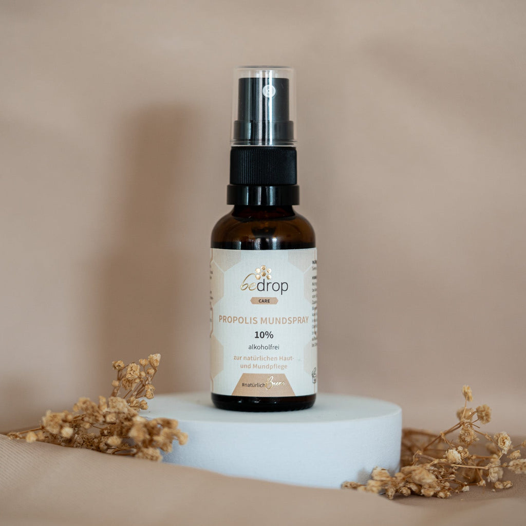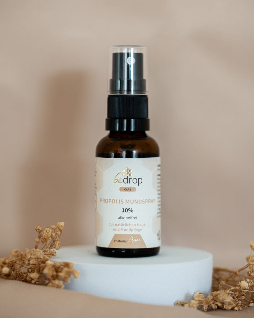 The alcohol-free propolis tincture mouth spray contains pure propolis from 100% natural sources without any additives or chemicals. The high-quality propolis comes from regional as well as supra-regional (e.g. Latvia), rural and idyllic apiaries. The water-soluble, precious propolis mouth spray can be used for various applications.